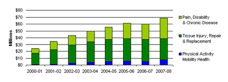 Historically, as noted in Figure 1, below, IMHA has made significant investments that have led to important outcomes, particularly in tissue injury, repair and replacement and pain, disability and chronic disease and in building capacity and momentum in physical activity, mobility and health.