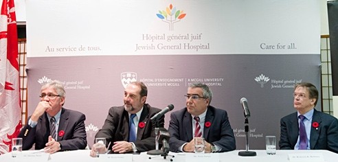 From left to right: Dr. Hartley Stern, Executive Director of the Jewish General Hospital, the Honourable Denis Lebel, Minister of Transport, Infrastructure and Communities, Dr. Samy Suissa, Director of the Centre for Clinical Epidemiology at the Lady Davis Institute and Dr. Roderick R. McInnes, Director of the Lady Davis Institute at the Jewish General Hospital.