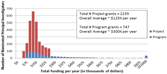 The grant values in the Design Discussion Document are averages based on the level of funding that researchers currently receive. The expectation is that grant values in both schemes will vary and be commensurate with the needs of each individual program or project. Modeling predicts a distribution of program and project grant values as shown in the figure below.