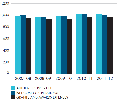 - As evidenced by the above chart, net cost of operations and grants and awards expenses increase or decrease on a yearly basis in relative proportion to changes in the Parliamentary authorities provided to CIHR by the Government of Canada.