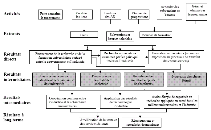 Le modèle logique ci-dessous du programme IRSC-Rx&D a été établi en consultation avec les gestionnaires du programme6. À noter que les objectifs du programme sont parmi les résultats du programme illustrés dans le modèle logique. Les résultats intermédiaires qui reflètent les objectifs énoncés du programme sont surlignés.