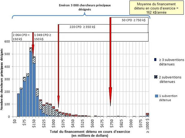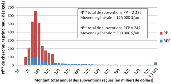 Les montants indiqués dans le document de travail sont des moyennes fondées sur le niveau de financement que reçoivent actuellement les chercheurs. On s'attend à ce que la valeur des subventions varie dans chacun des volets. On prévoit une distribution des montants pour les programmes et les projets correspondant au graphique ci-dessous.