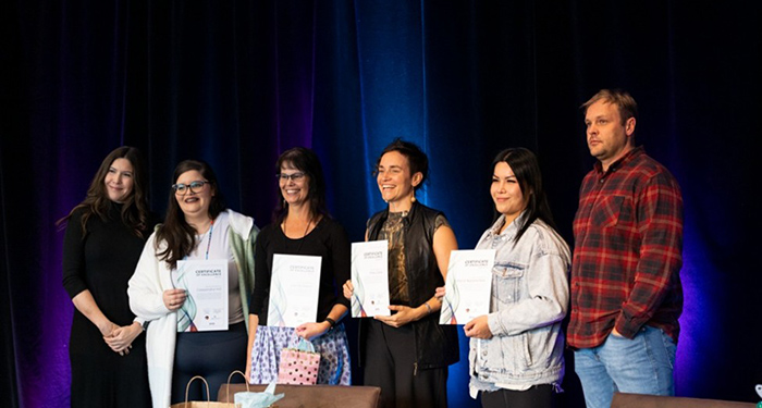 From left to right: Dr. Chelsea Gabel (Scientific Director, CIHR–Institute of Indigenous Peoples’ Health), Cassandra “Cassie” Hill, Laurie Sherry, Moe Clark, Sheila Naytowhow, and Dr. Robert Henry (Chair, NEIHR National Coordinating Centre).