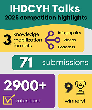 IHDCYH Talks 2025 competition highlights: Three knowledge mobilization formats were accepted (infographics, videos, and podcasts), 71 submissions were received, over 2900 votes were cast, and there were 9 winners.
