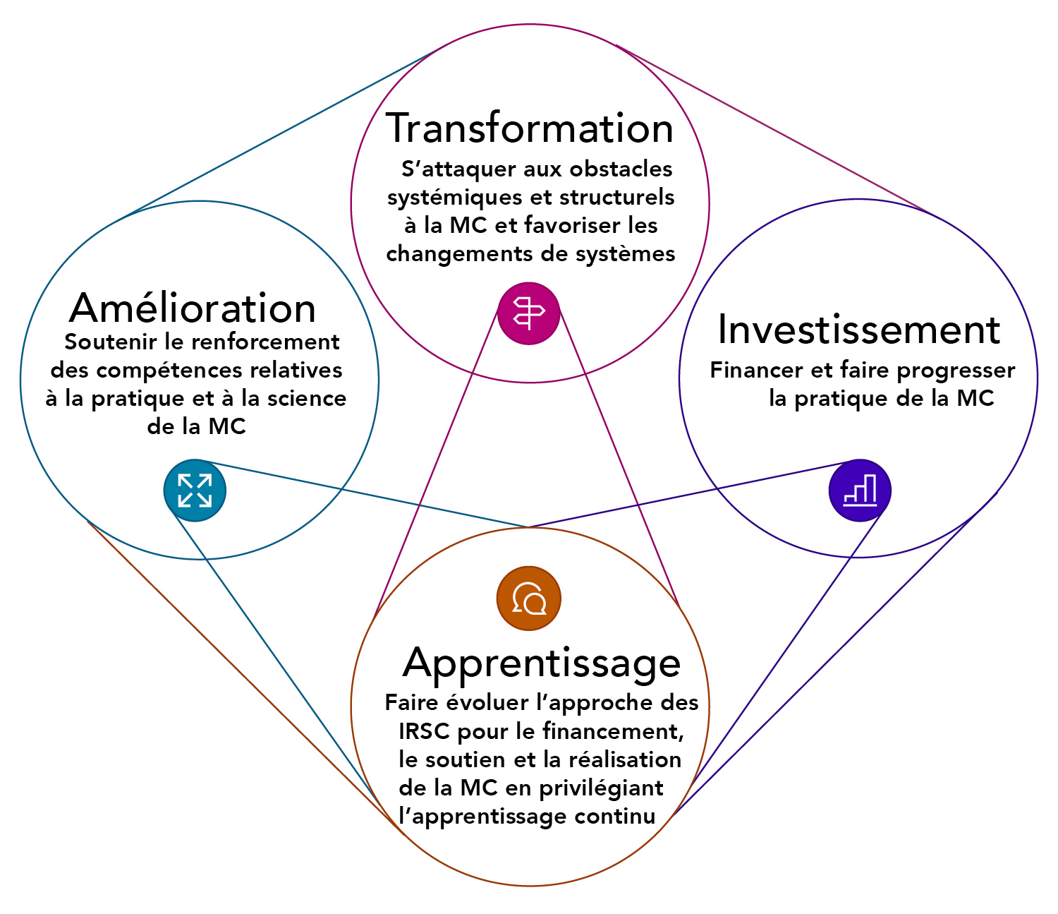 - Transformation : S'attaquer aux obstacles systémiques et structurels à la pratique de la MC et favoriser les changements de systèmes