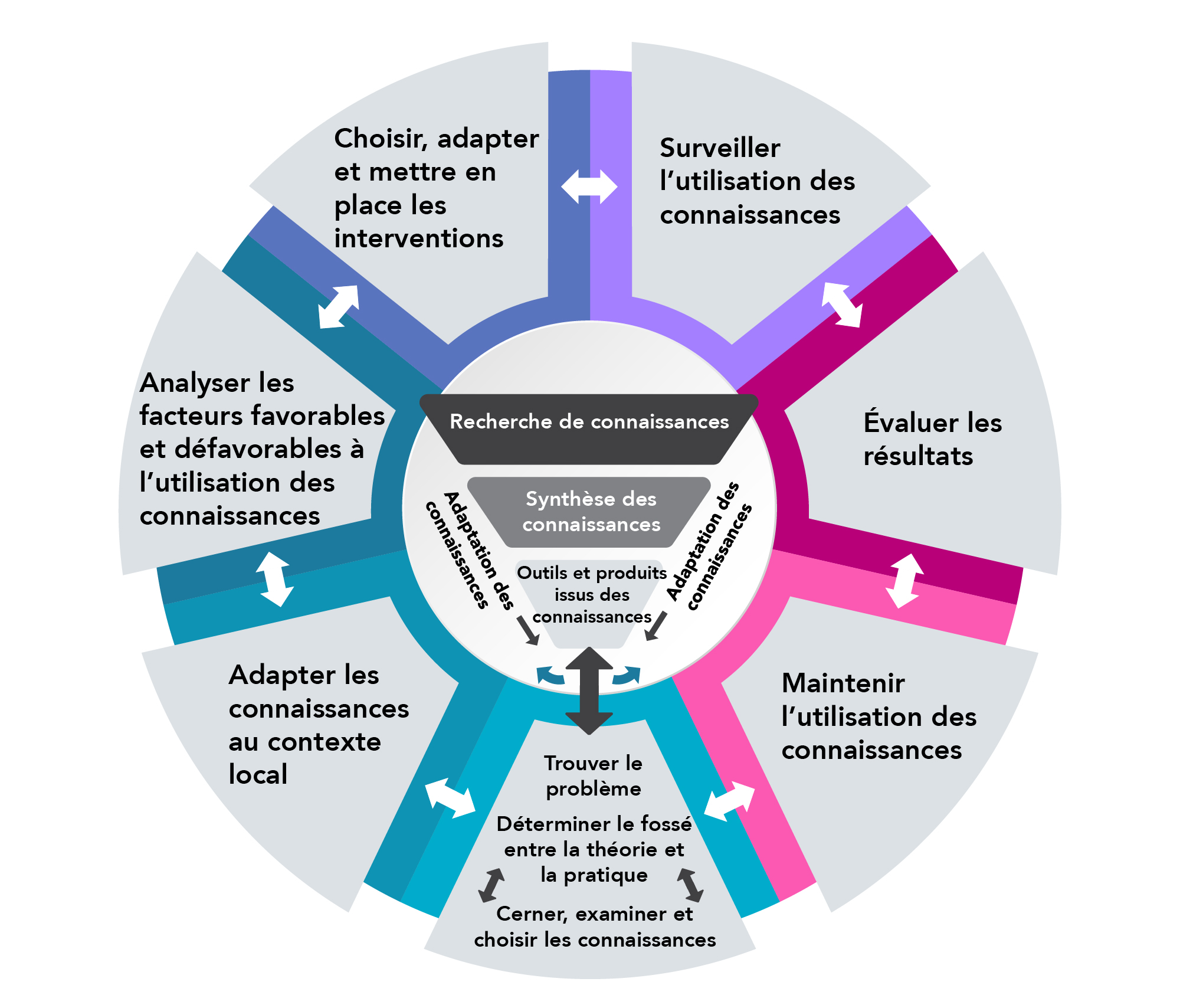 Le cycle de la mise en pratique qui entoure l'entonnoir se compose de sept étapes reliées entre elles par des flèches bidirectionnelles. Dans l'étape du bas, on peut lire : « Trouver le problème », « Déterminer le fossé entre la théorie et la pratique » et « Cerner, examiner et choisir les connaissances ». Le reste des étapes se lisent comme suit, dans le sens horaire : « Adapter les connaissances au contexte local », « Analyser les facteurs favorables et défavorables à l'utilisation des connaissances », « Choisir, adapter et mettre en place les interventions », « Surveiller l'utilisation des connaissances », « Évaluer les résultats » et « Maintenir l'utilisation des connaissances ».