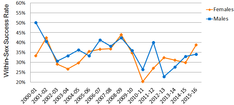 Methods: The data in this section represents the competition results of CIHR’s and tri-agency’s award programs from 2000/01 to 2015/16. Please note that, unless specified, the data is presented as within-sex success rates to take into account the proportions of applications received from males and females.