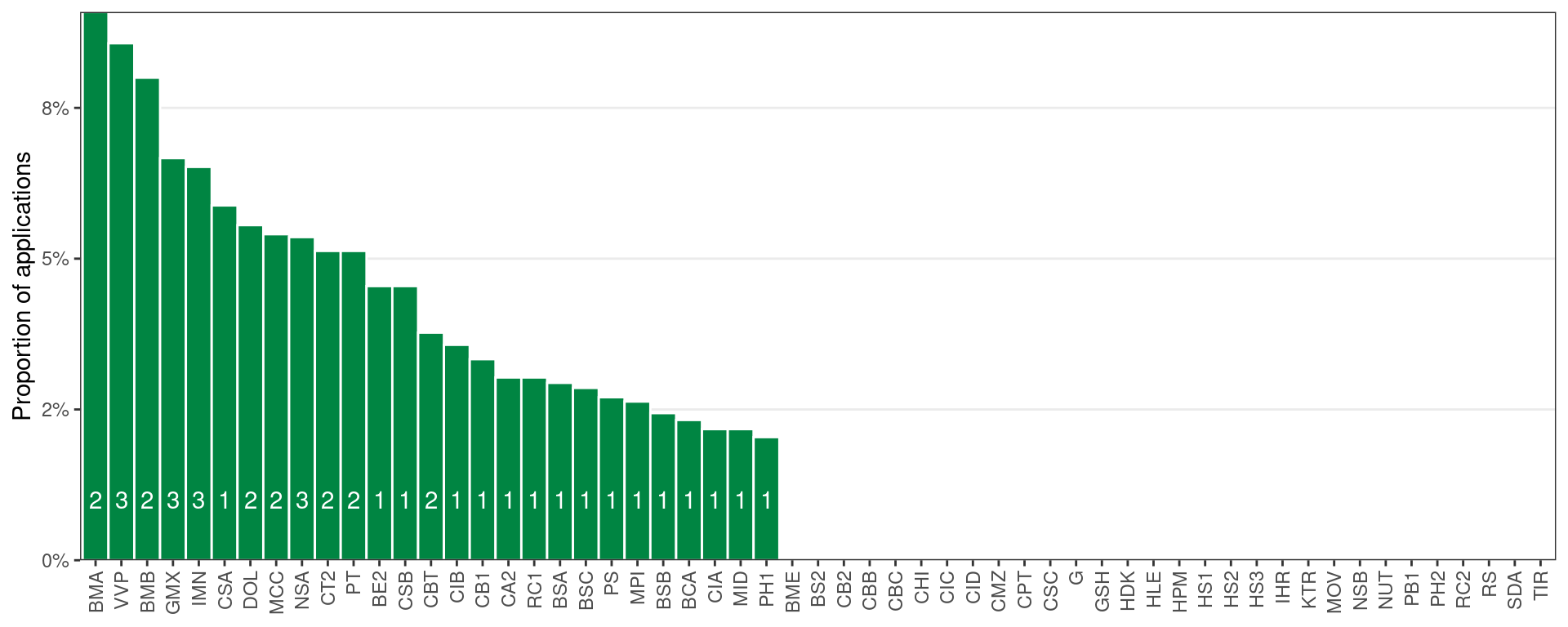 A total of 1011 applications, representing 53.2% of all submitted applications, were streamlined in this competition. Additional details are provided in the tables below.