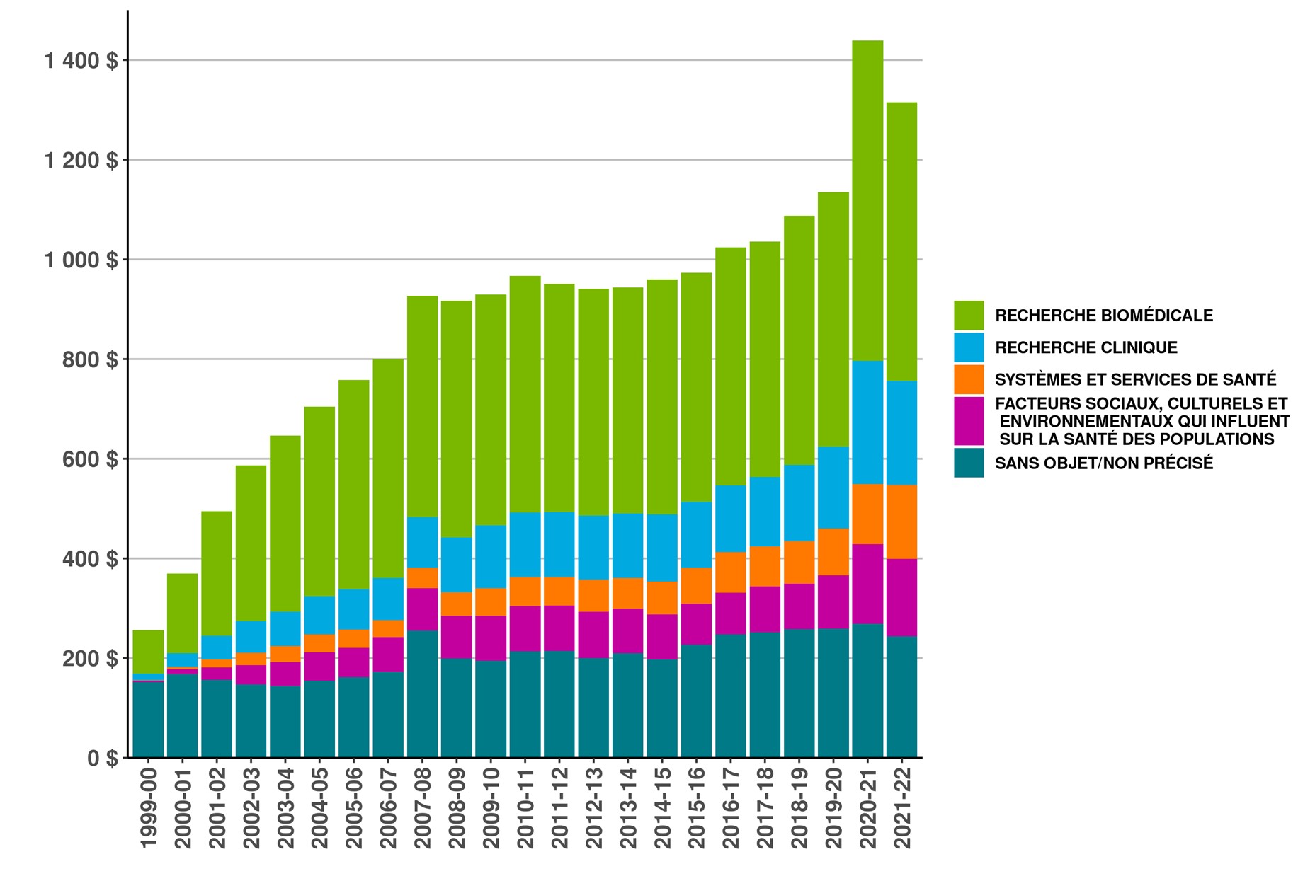 Figure 1 : Investissements des IRSC par thème principal et par exercice depuis 2000-2001 (en millions de dollars)