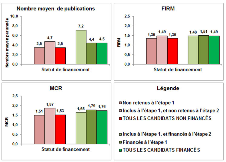 - De même, les indicateurs d’impact montrent que les candidats financés ont publié dans des revues ayant une meilleure visibilité (FIRM de 1,47) que leurs pairs non financés (1,33), et que leurs articles sont plus fréquemment cités (MCR de 1,73 c. 1,49).